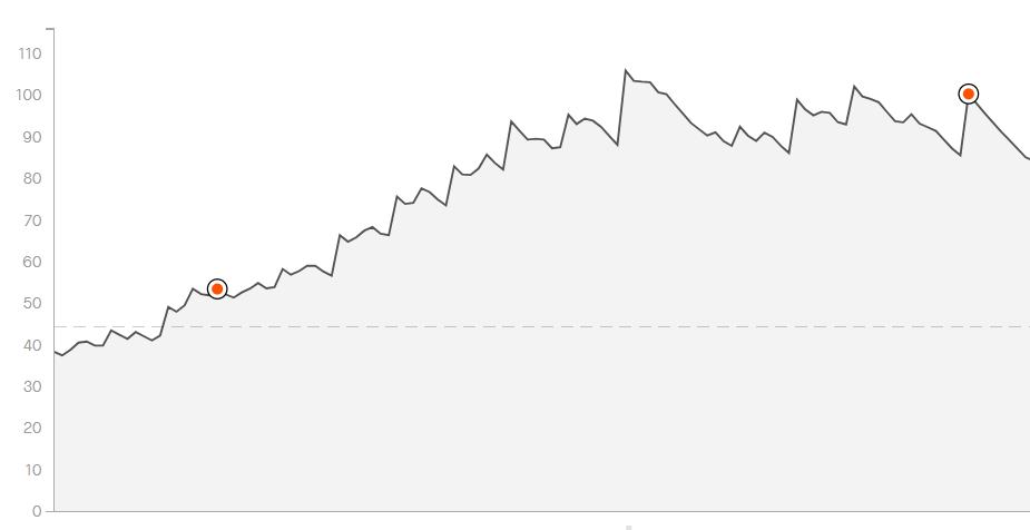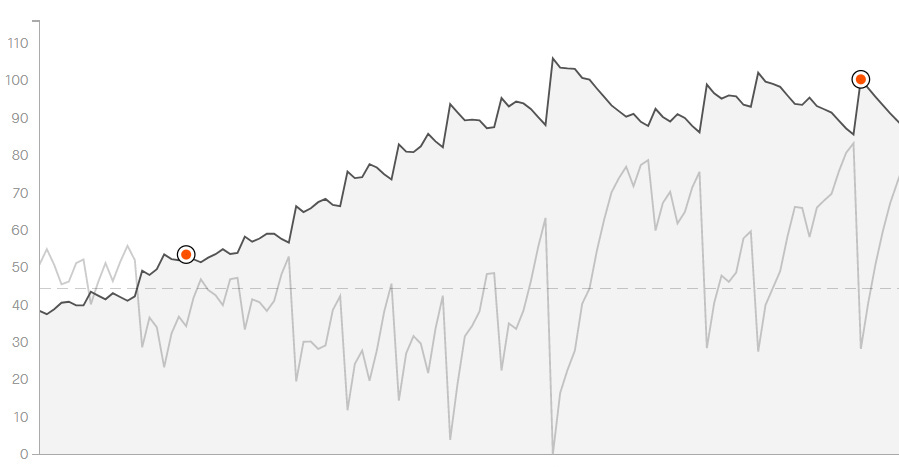 Over the summer months, I prioritized my training and ran five days a week for the 16 weeks (112 days) before the race. My two days off per week were dedicated towards recovery and "prehab" for my acclimating legs. All seven days of the week were useful in inching towards my goal of running a marathon. If we apply the same exponential equation as above, 1.01^112 = ~3. Thus, If I improved 1% as a runner each day I showed up to race-day a three times better runner than when I began. An overall improvement of 3x feels about right, but only as a ballpark estimate. Luckily, Strava Premium has a feature that tracks your fitness level with hard numbers. Let's check out the results...
